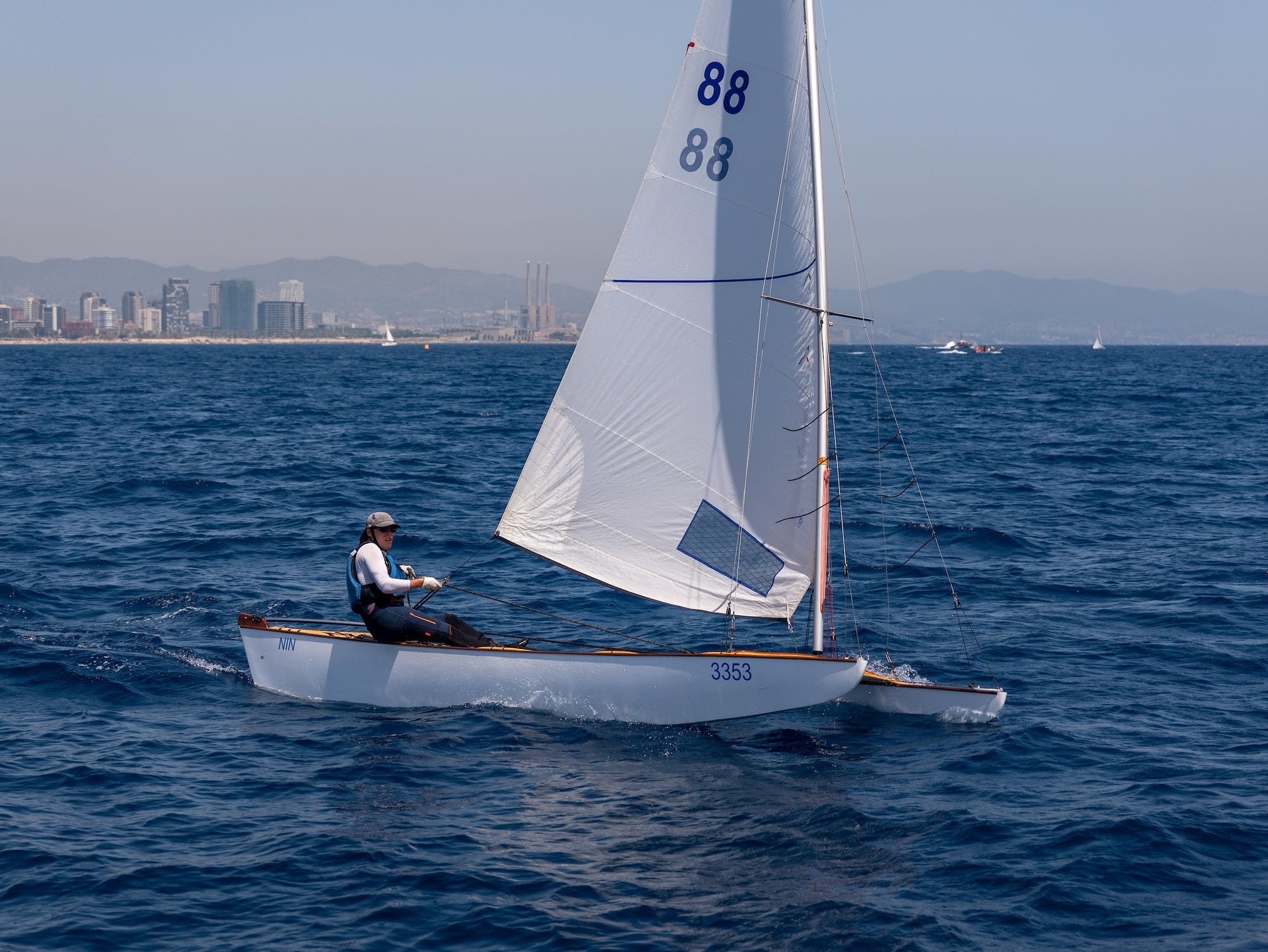 It’s rare for professional sailors to look at a boat and go: “how does that work?” But down in Barcelona there is such a craft – the Patín de Vela, or more commonly the Patín Catalán – a hugely popular 18-foot-long, beach-launched catamaran with a 5.24-foot beam that has no rudder, no centreboard, no boom and is controlled by minute adjustments on the dovetail mainsail and exquisite use of body weight to steer.