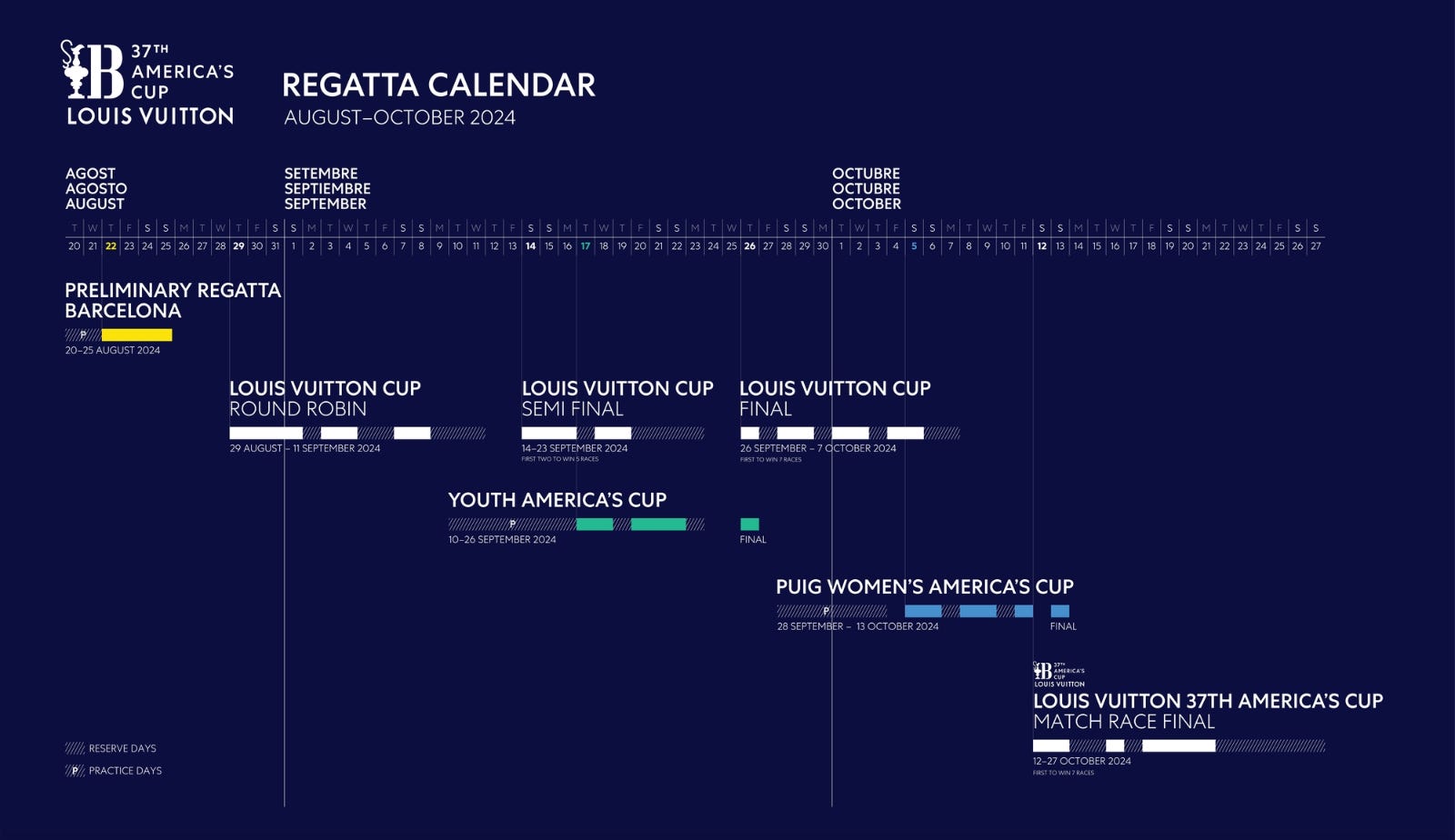 Following three days of boat measurement and scrutineering on Monday / Tuesday / Wednesday August 26 - 28 – the first round robin stage of the Louis Vuitton Challenger Series begins on Thursday August 29 and runs for four days to Sunday September 1 with four match races per day (The final race on September 1 will be the first match of RR2). Monday September 2 is a reserve day)