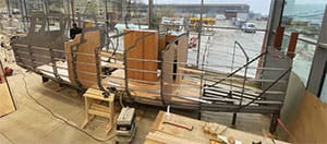 Schernikau’s investment has transformed a 20th century industrial space into a 21st century modern production facility. The current build shed has glass walls on two sides, flooding the space with light and giving views onto the Kieler Forde, smooth concrete floors with underfloor heating, sound insulation, bending machines to form aluminium parts, a laser cutter, a 6x4x2m five-axis milling machine and a 53ft dry pool into which in-production boats can be lowered, to make working on them easier. The reason behind this says much about the three shareholders’ shared vision for this yard: happy workers make happy boats for happy clients.