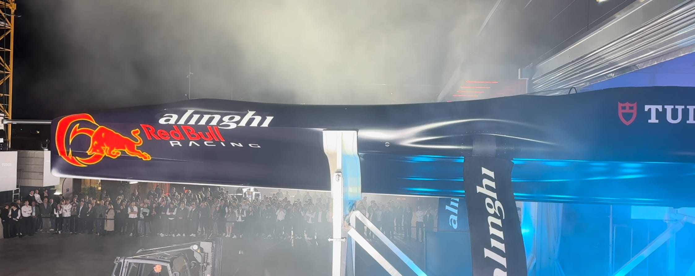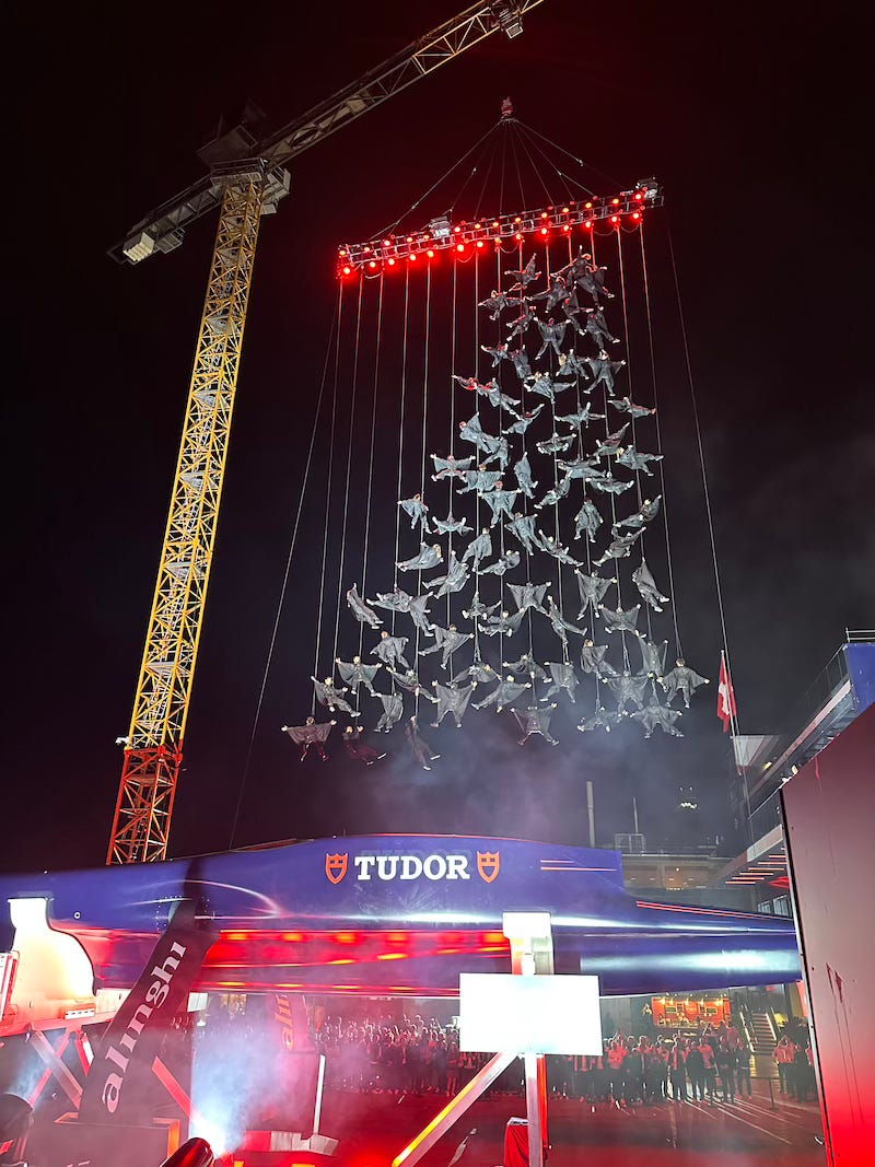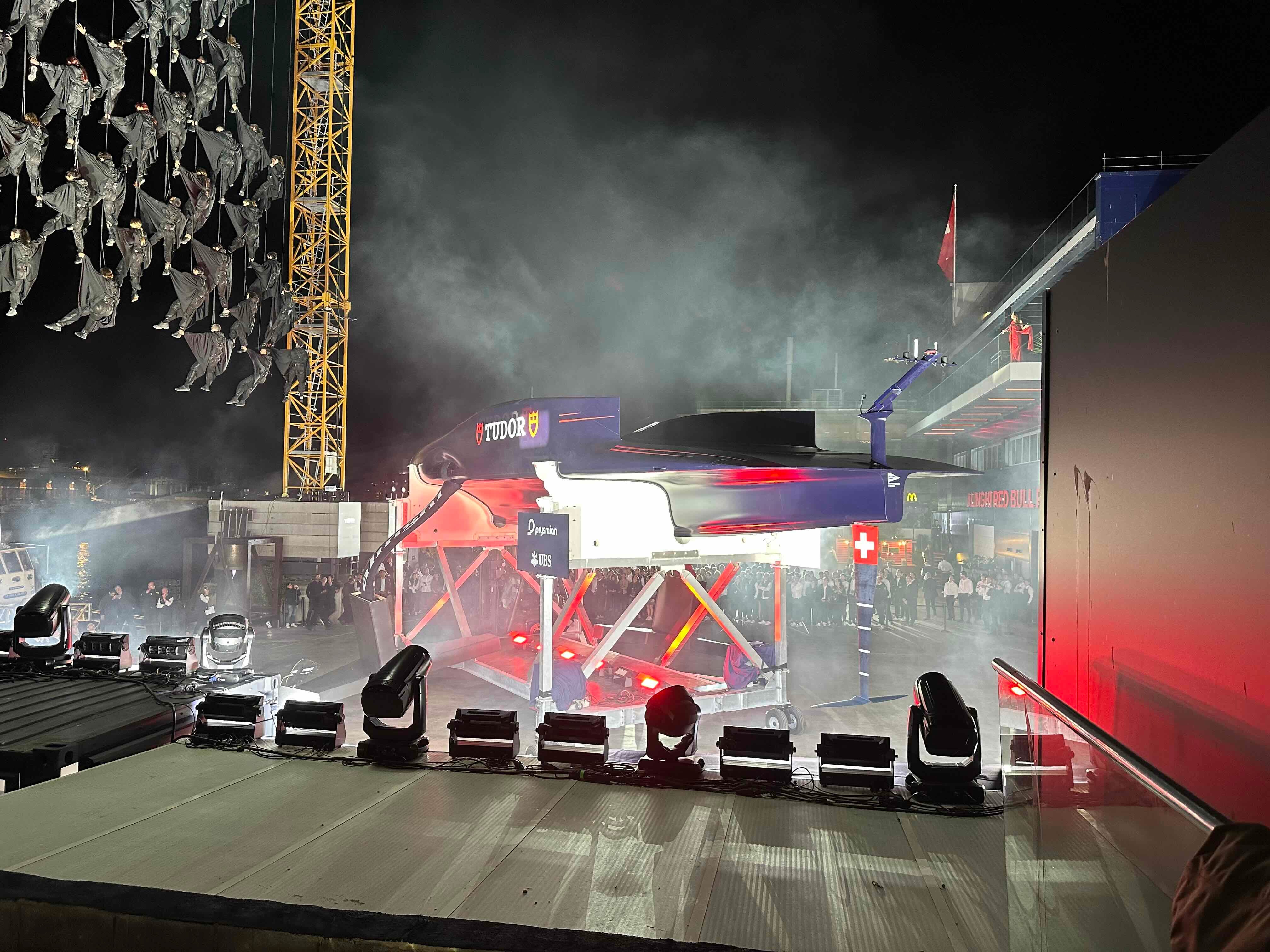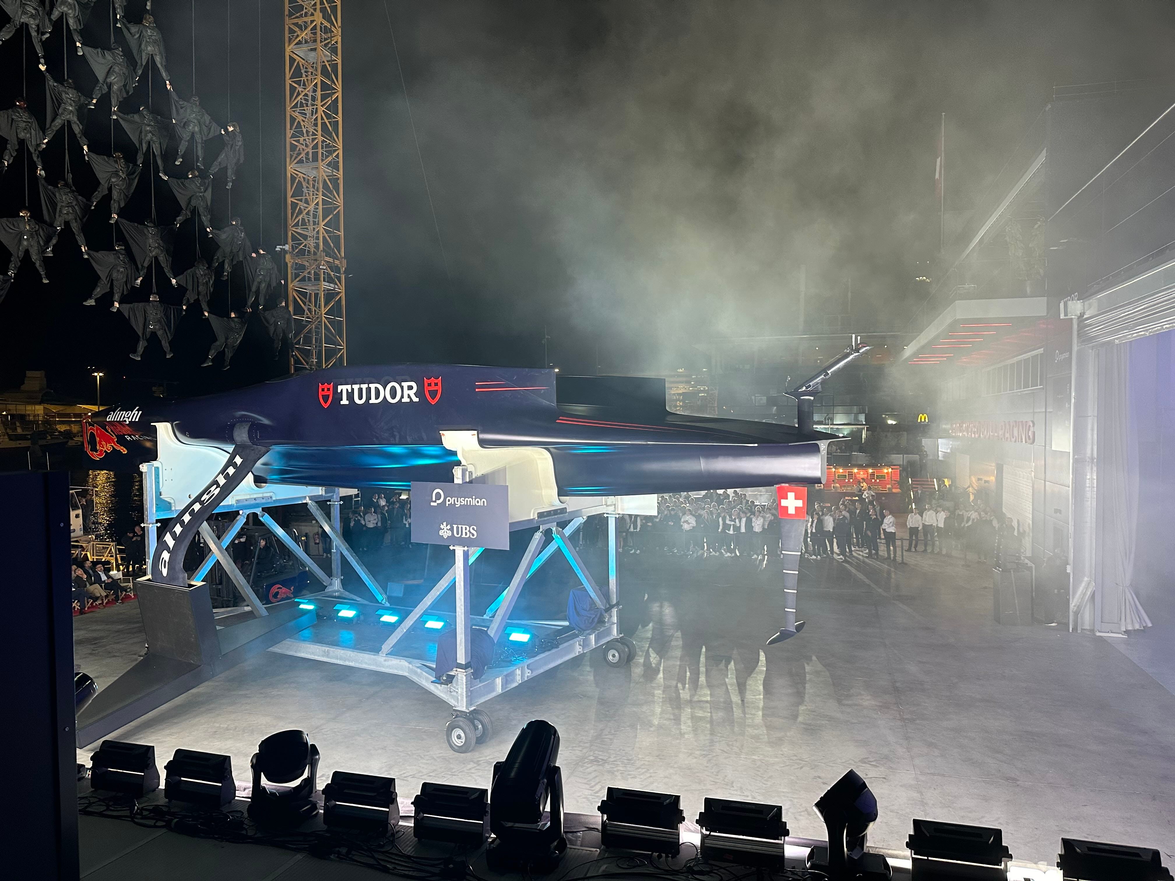 With the Alinghi Red Bull Racing bell - a huge brass bell engraved with the team logo that they use for every dock-out - tolling the arrival of ‘BoatOne’ as she slid from her shed under the spotlights, with scenic music and faux-smoke, this was classic Swiss dramatism at its very best.