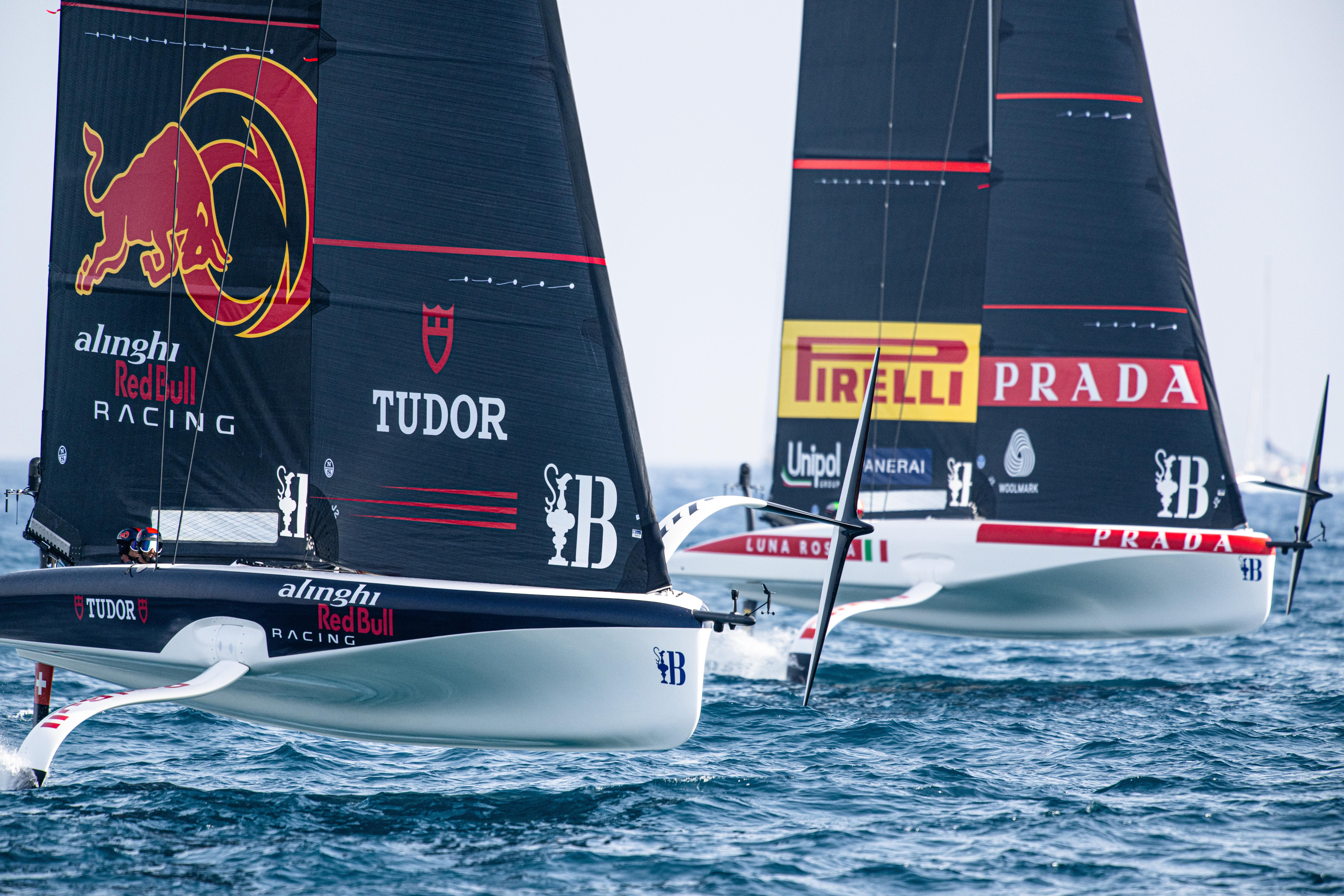 Behind, the big battle was between Luna Rossa Prada Pirelli and Alinghi Red Bull Racing who had a thrilling battle behind the front two boats. The second downwind leg saw the wind drop a knot or two and suddenly it was the teams that could adapt their mode and trim to the conditions that benefitted. At the second leeward gate, a brilliant tight gybe around the mark saw the Swiss stay ahead of Luna Rossa Prada Pirelli but by the top of the second beat, Luna Rossa Prada Pirelli was in touch and on their transom.