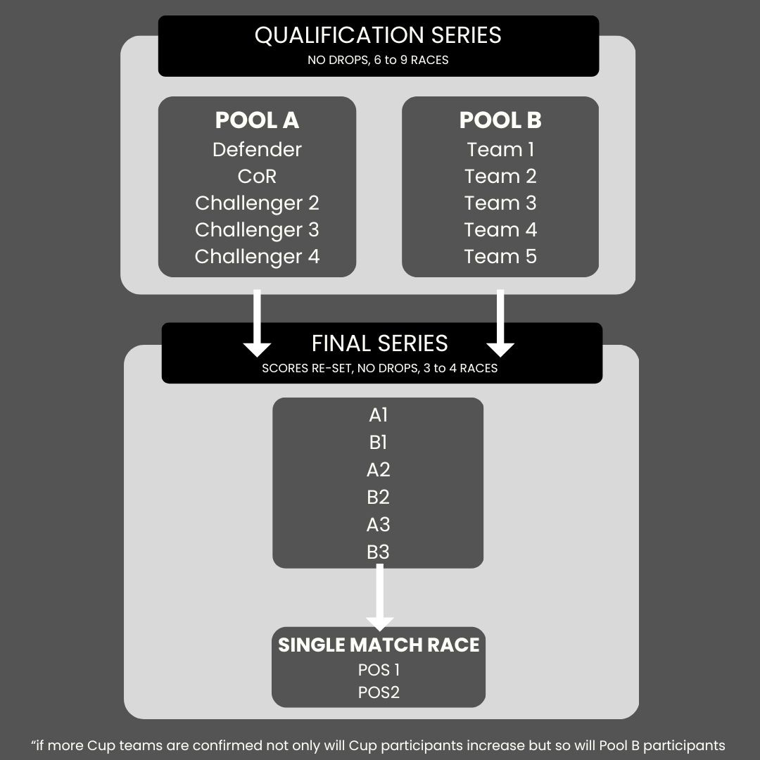 In both events each six team pool will race a series of six to nine fleet races with the top three teams from each pool progressing to the final series of three to four fleet races to decide the top two teams to compete in a single winner-takes-all match race final.