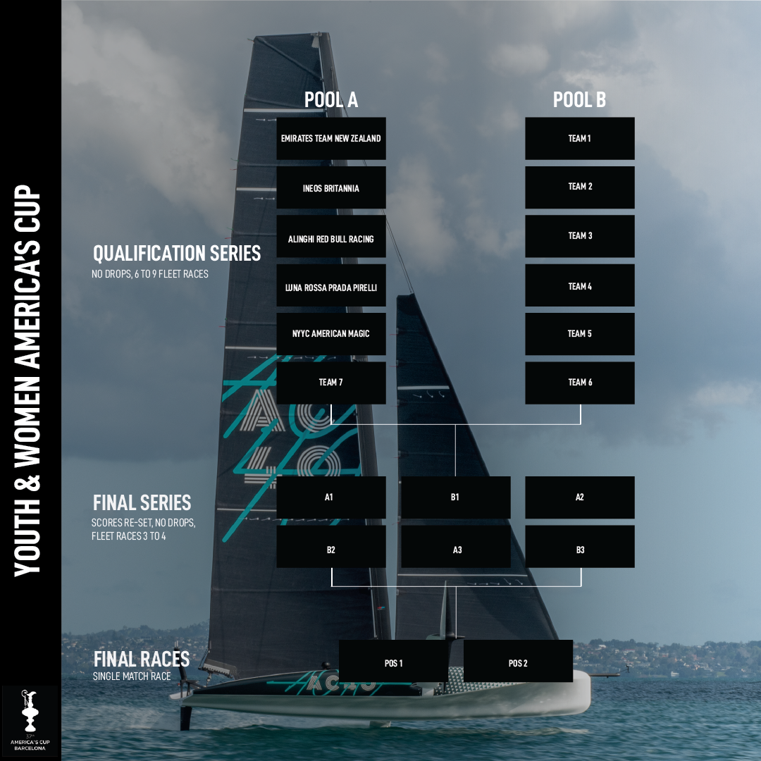 Those successful teams will then move forward to a ‘Final Series’ of four fleet races on one day to produce the top two teams who will advance on to the respective Youth and Women’s America’s Cup Single Matches to determine the respective winners.