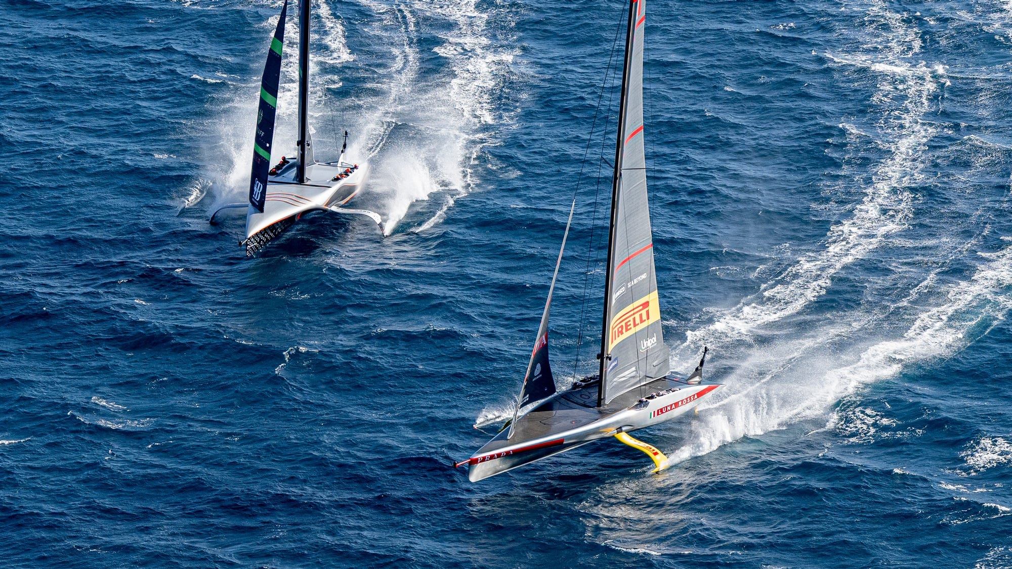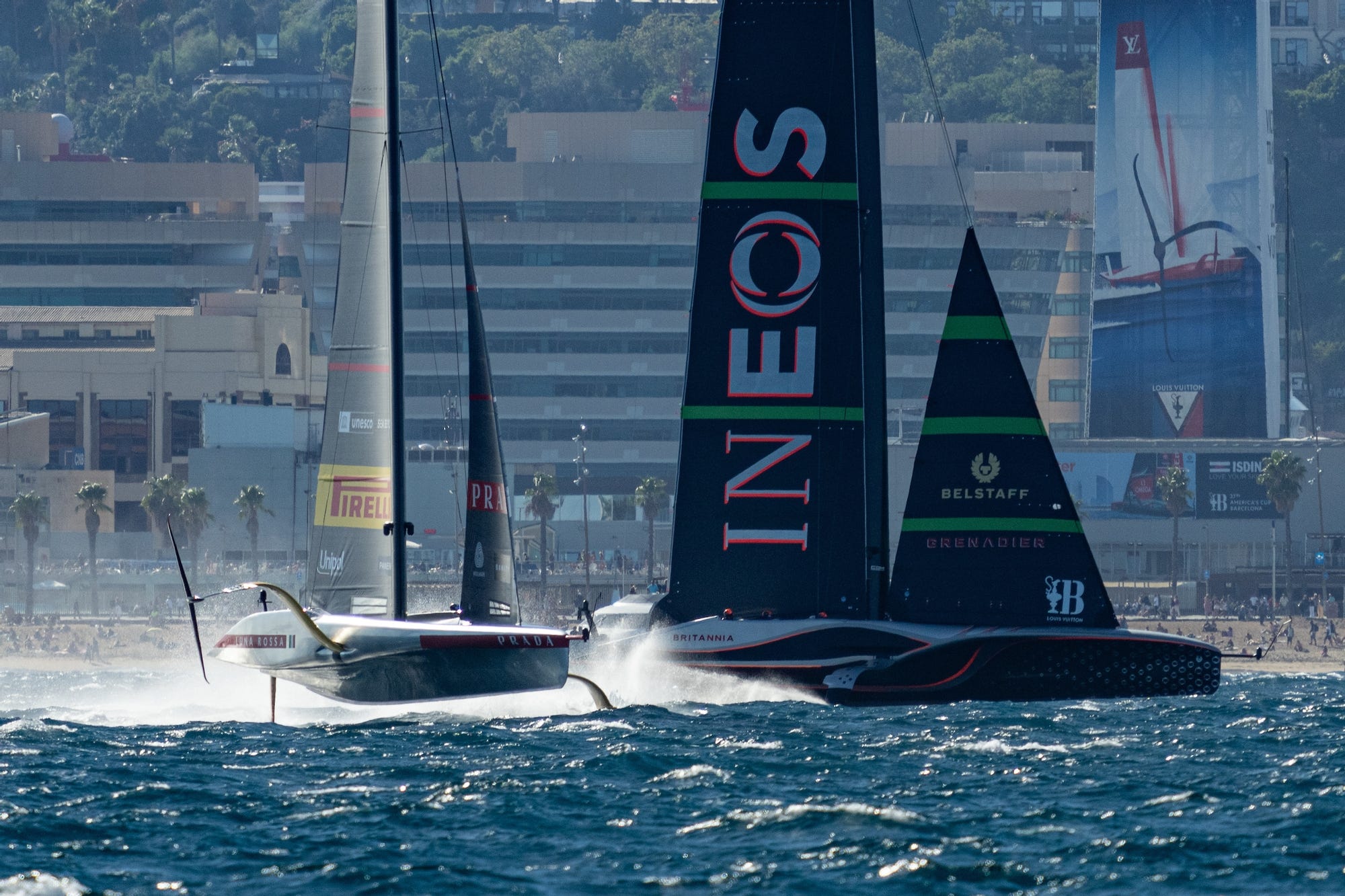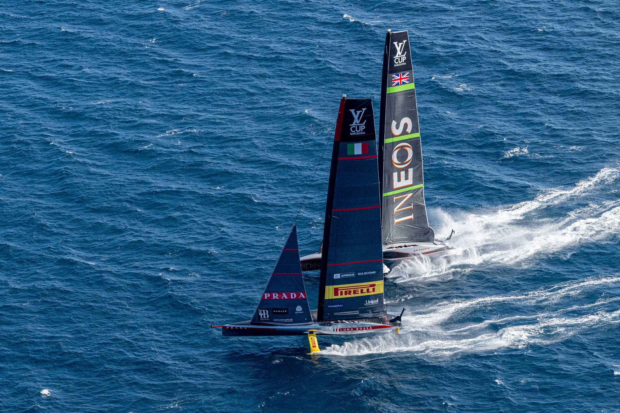 INEOS Britannia entered on time from the starboard end at close to 48 knots and immediately set about hunting down Luna Rossa, forcing the Italians to take avoiding action out on the left side, before a long trail back across the starting box with the British close behind on their leeward hip.