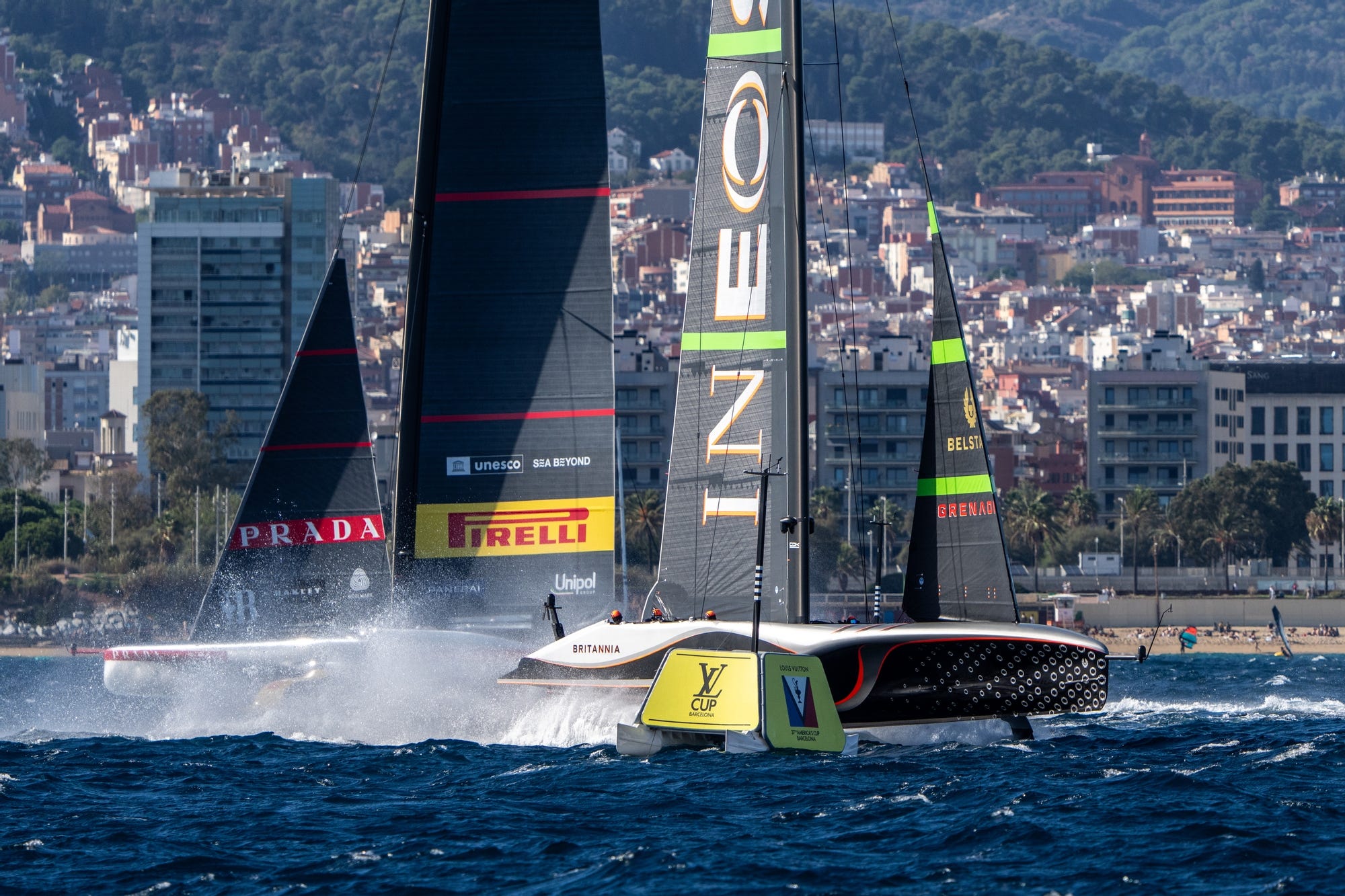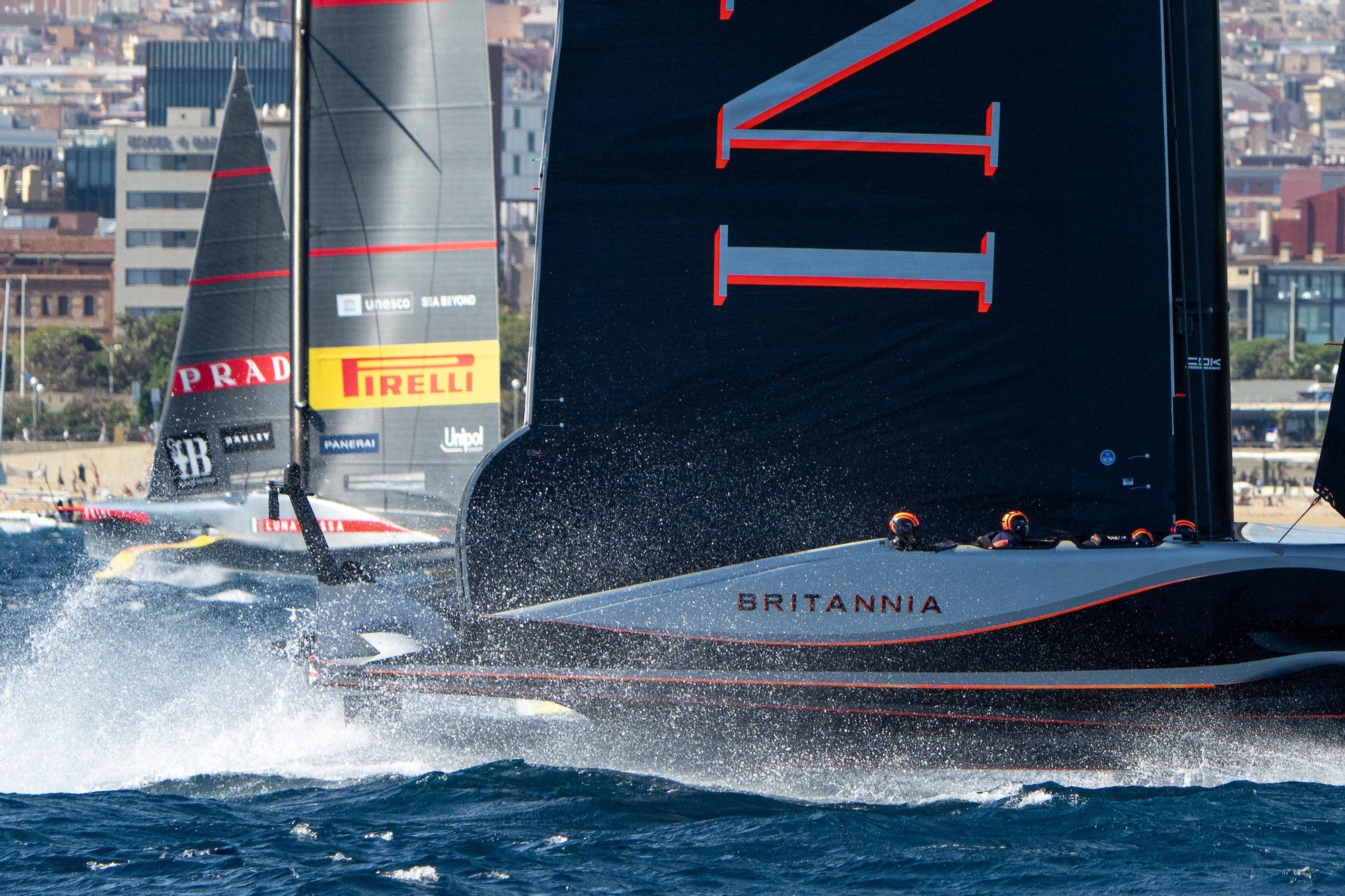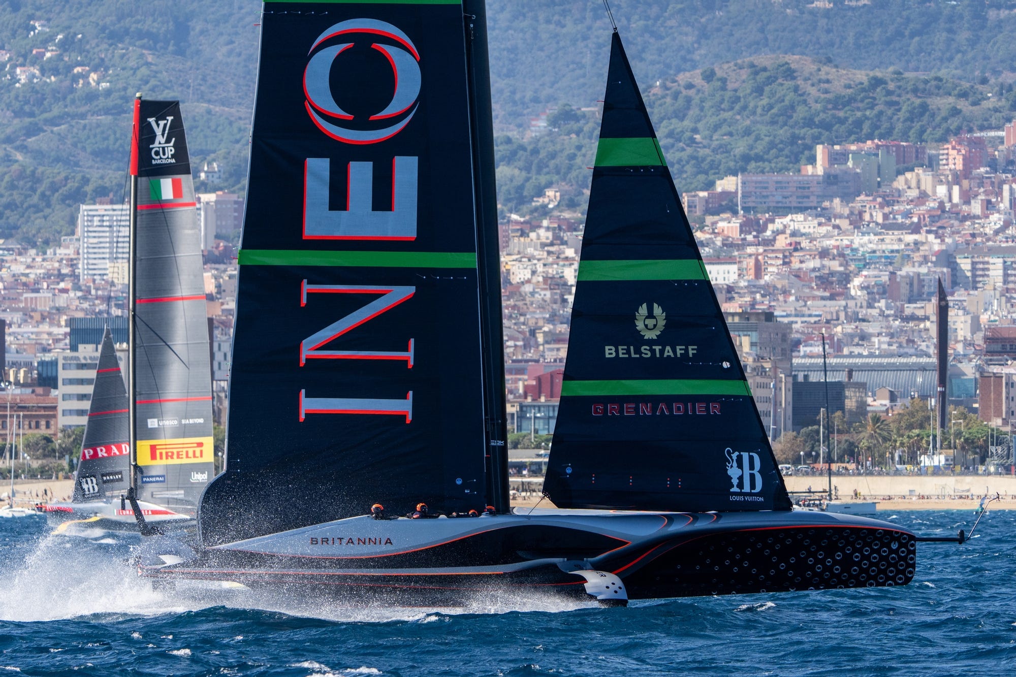 INEOS Britannia entered on time from the starboard end at close to 48 knots and immediately set about hunting down Luna Rossa, forcing the Italians to take avoiding action out on the left side, before a long trail back across the starting box with the British close behind on their leeward hip.