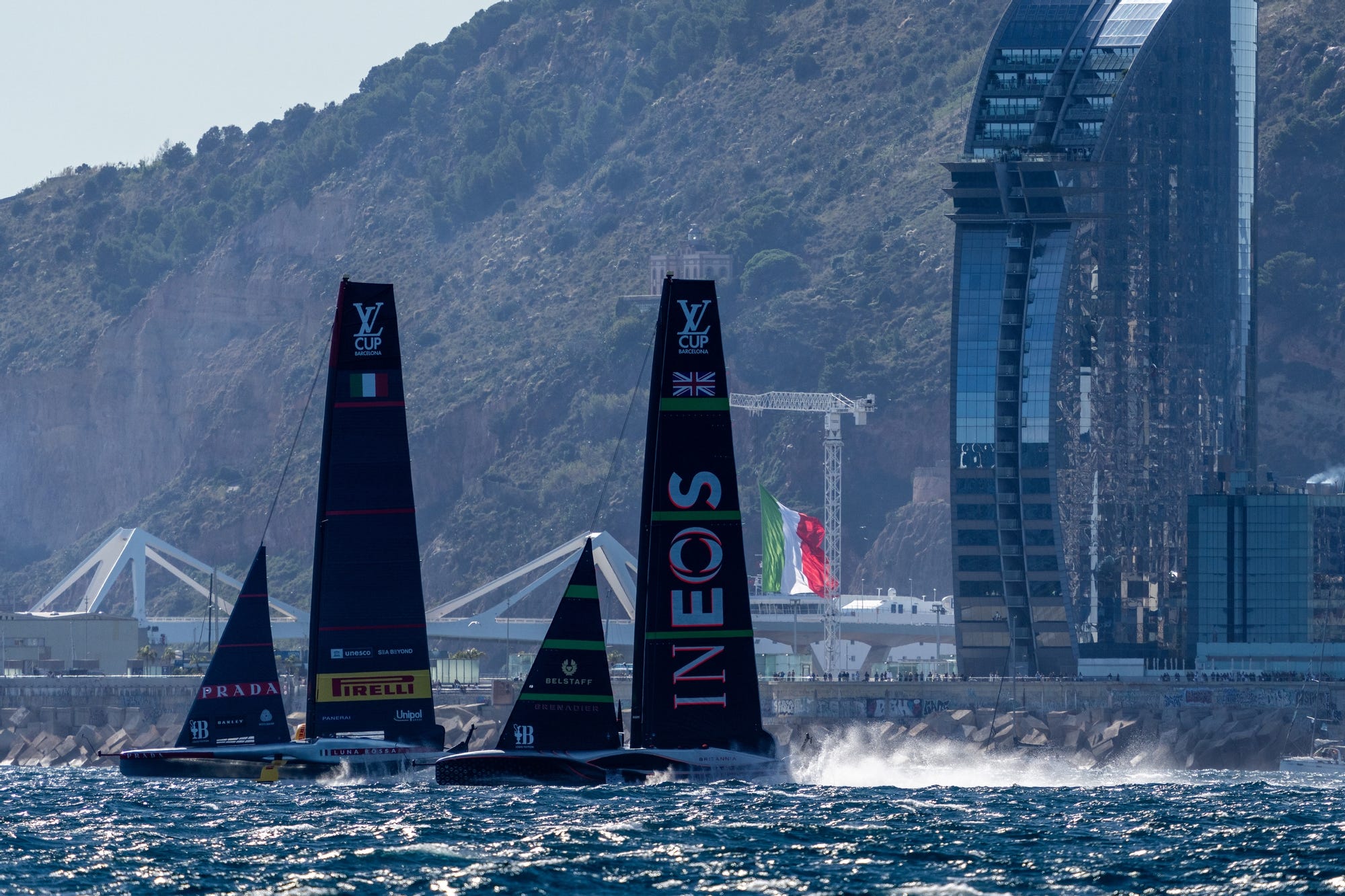 INEOS Britannia and Luna Rossa Prada Pirelli, the outstanding finalists in the Louis Vuitton Cup were kept on standby prior to racing today as a solid Mediterranean ‘Garbi’ breeze pushed frustratingly above the stipulated 21-knot upper wind-range. Eventually the breeze settled, allowing the two teams to serve up one of the classic gladiatorial contests that are synonymous with the America’s Cup through its history.