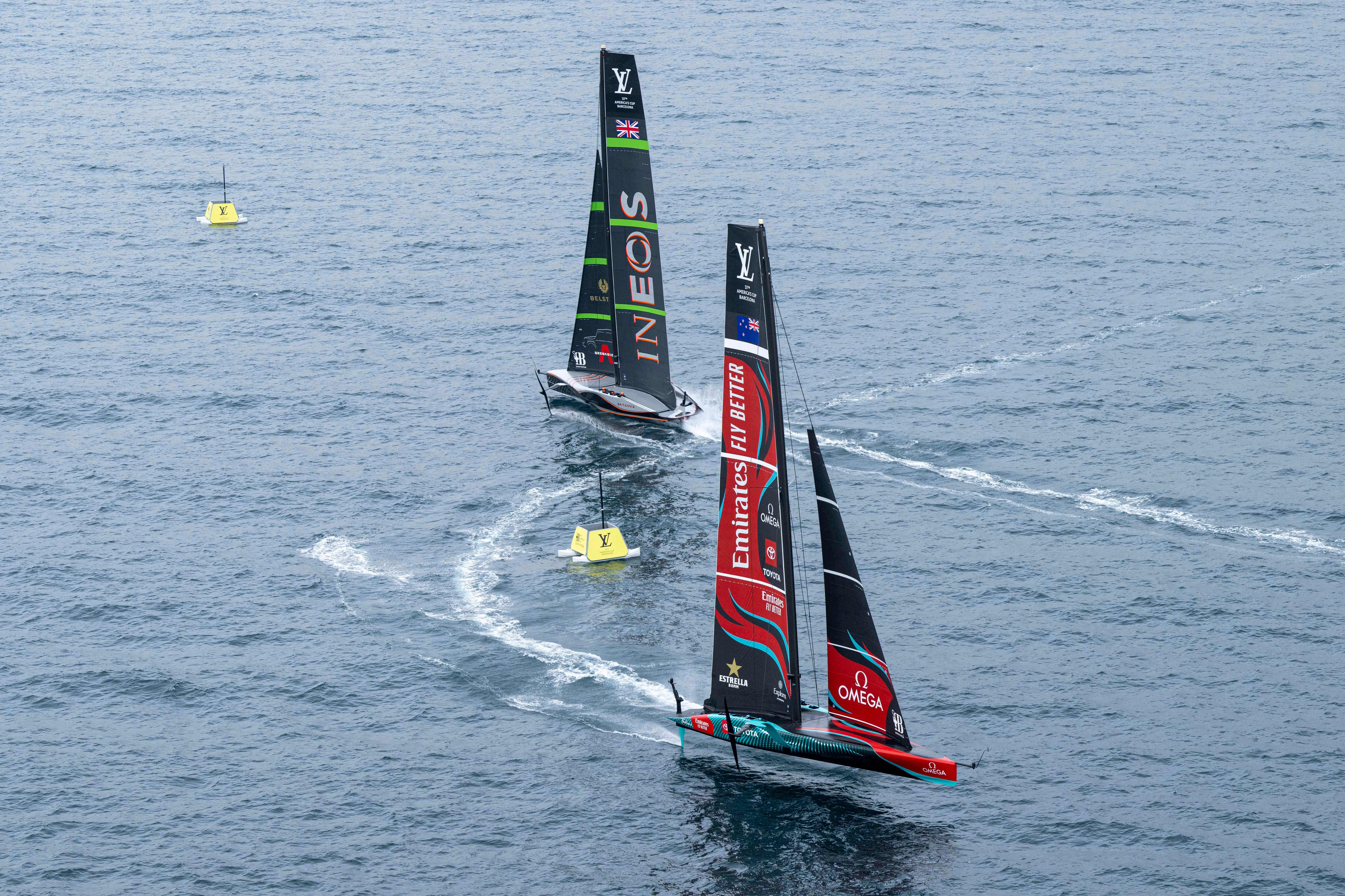 Racing got underway after a short postponement with INEOS Britannia struggling to get into flight down at the bottom of the pre-start box with three minutes to go, whilst Emirates Team New Zealand were well into their drills to start at the port end of the line. The British were late, entering with only just over a minute to go and were faced with a determined Kiwi team who were doing their level best to disrupt airflow, positioning and the ultimate lead back to the line.