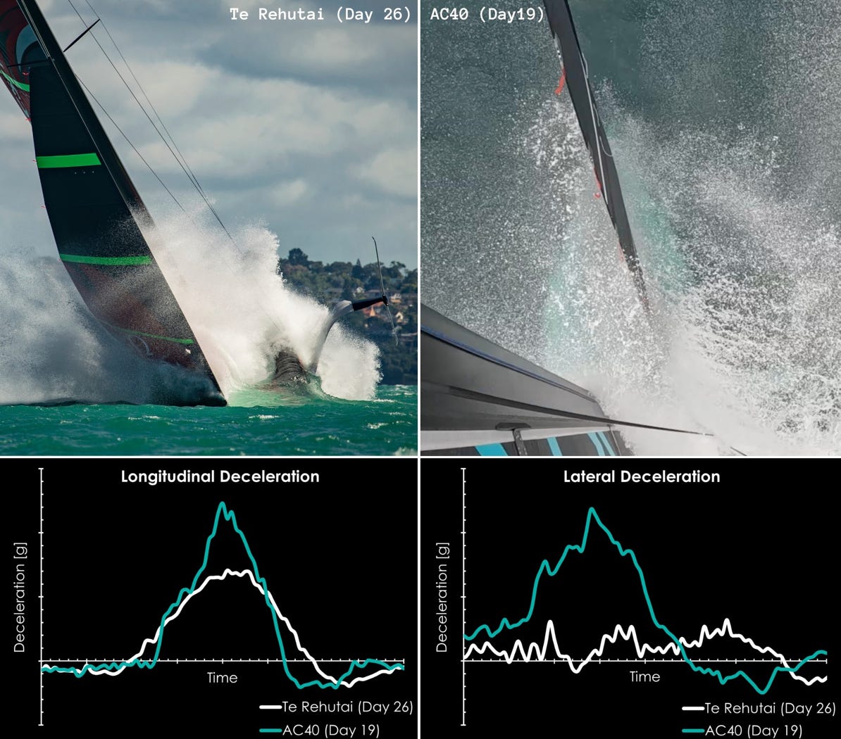 “The figures below compare the longitudinal and lateral decelerations from the AC40 crash against the largest event seen by Te Rehutai, [the team’s AC75 from the last America’s Cup (pictured left below].