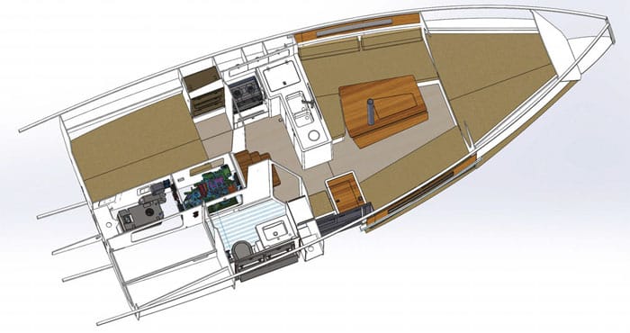 ‘We went through 15 to 20 design iterations. We had to be careful because it’s not a racing boat, it’s not for specialists. It needs to be able to go around the world but it also has to be a family boat, used just for a few weeks in the summer. You have to blend all these different stories into one boat, which is quite hard. Grand Large Yachting is pushing for world rallies and cruises so we had to make sure it’s a Category A boat that can cross oceans without too many changes, which is quite a big task on a smaller boat.’