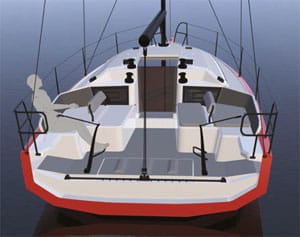 ‘We took the RM 970, which was a 10- year-old design, and we went through the same design process as the RM 1080. We wanted to have a fast reaching boat, that’s why we have the high cockpit coamings. We moved the mast aft quite a bit, 150mm, then we moved the keels and the rudders and she is much more powerful than the RM970. The bow is wider, that’s where we get the power. She will be quite fast reaching and downwind.’