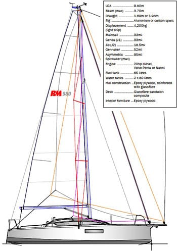 With full mainsail and furling J1 by Incidence on a Z Spars two-spreader aluminium mast (there is a carbon option), the RM 980 has 66m2 (701ft2) of upwind sail area. Offwind, a combined bowsprit/ anchor roller flies a 77m2 gennaker and a 105m2 asymmetric. There is also the option of a 15.5m2 (167ft2) staysail, on a fixed stay or flying on a 2:1 halyard, with a furler and running backstays.