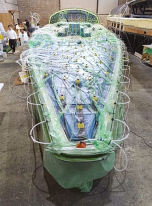 With such a lightweight displacement target, ICE Yachts’ meticulous construction process is carefully monitored. ‘We're keeping track of all the weights and their positions on board through a constantly updated CG file,’ says project manager Arturo Bono, who has been with the company’s technical office for seven years. ‘During construction every weight is double checked, and total weight distribution is monitored through load cells under the boat cradles.’