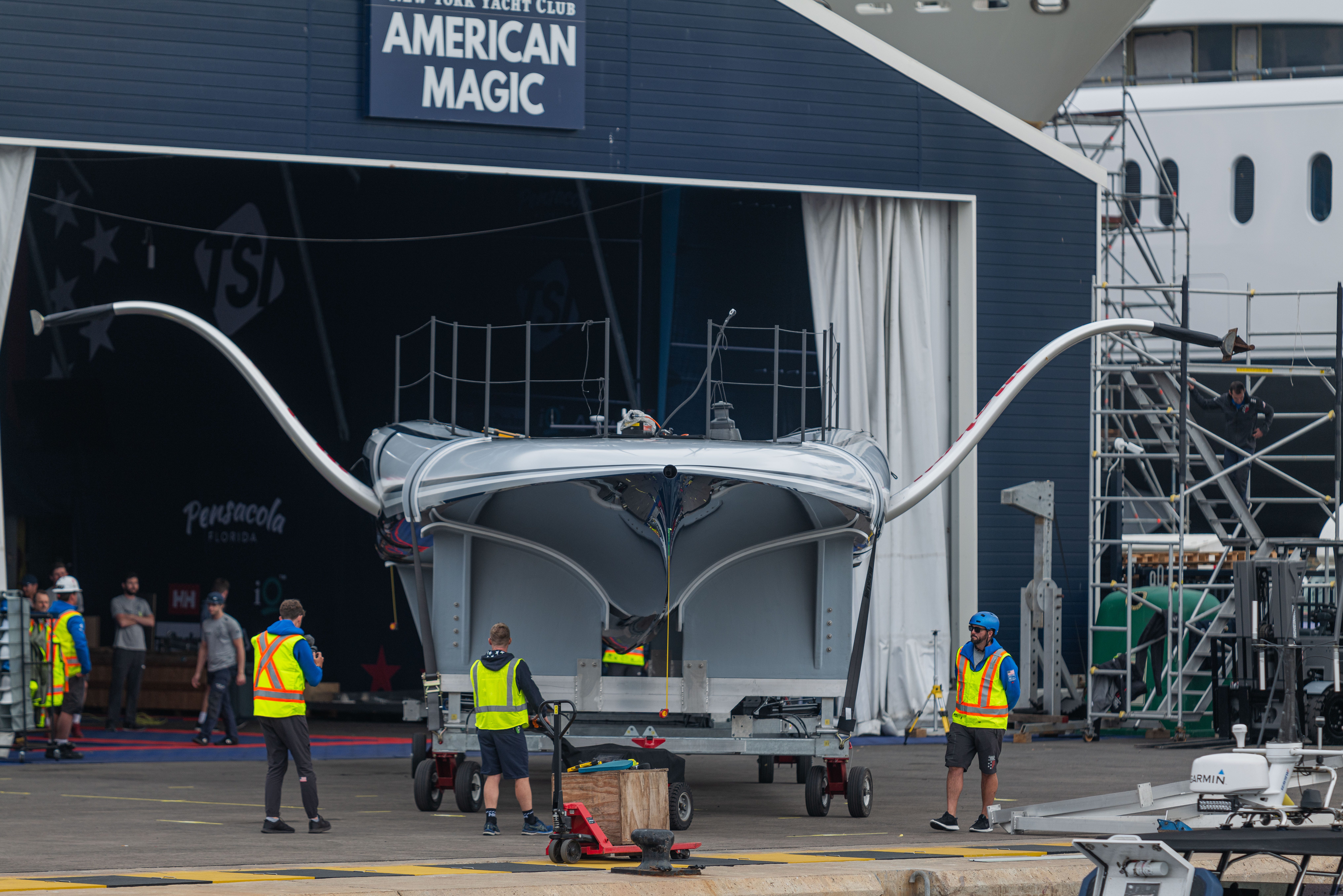 On Thursday, April 25th, B3 made its debut as it emerged from the NYYC American Magic base. Previously hidden, it had traveled 3,500 miles from its construction at the build facility in Portsmouth, Rhode Island, to its current home in Barcelona.
