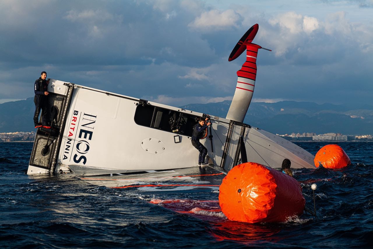British Challenger of Record INEOS Britannia has suffered a setback to its campaign for the 37th America’s Cup on Wednesday after capsizing their T6 LEQ12 test boat during a fast and furious testing session in winds gusting to 18 knots on Palma Bay.