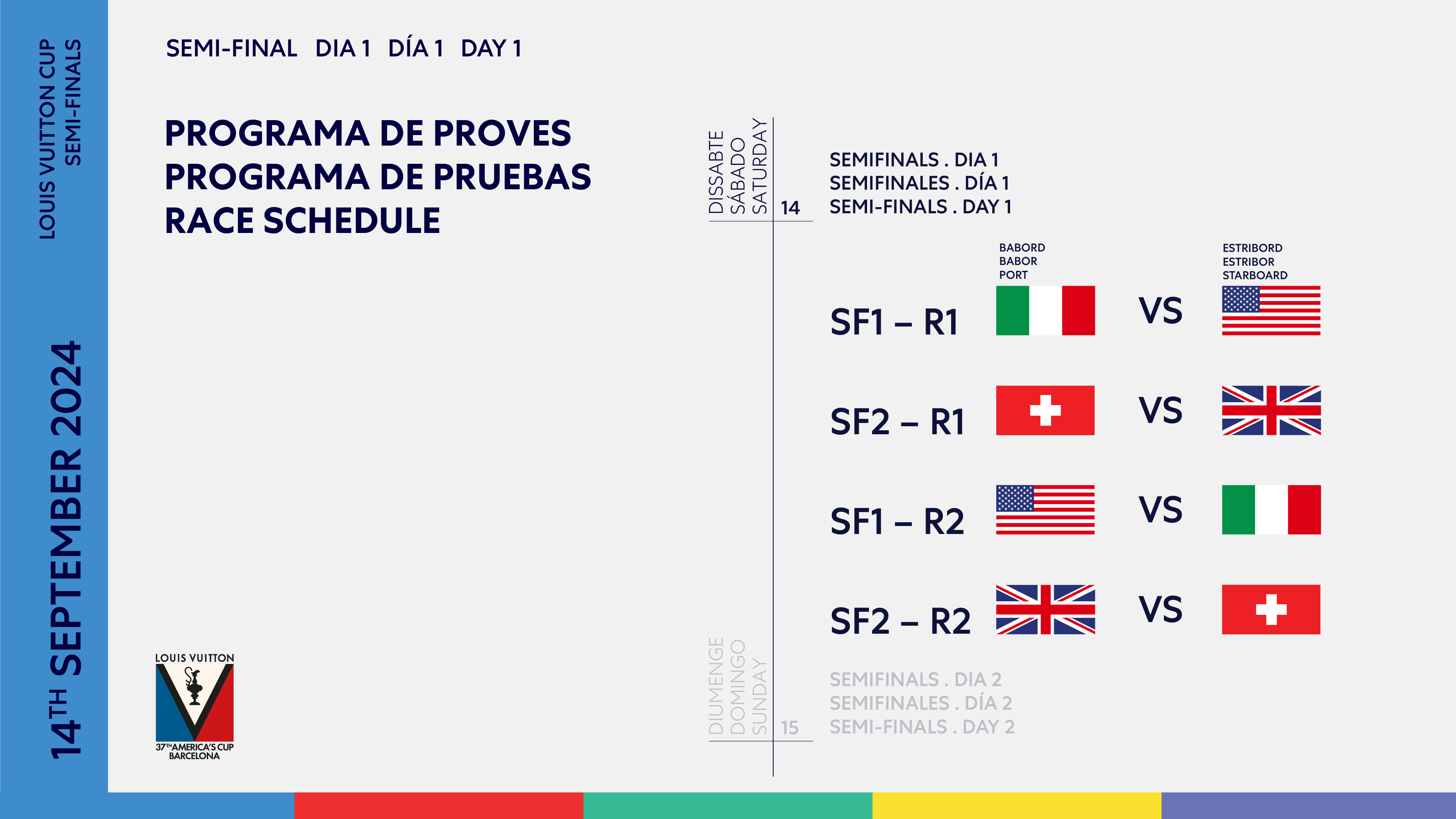 Racing starts on Saturday September 14 and is scheduled to continue through to Monday 16 September, before the first planned Reserve Day on Tuesday September 17, with two races planned for each semi-final per day.
