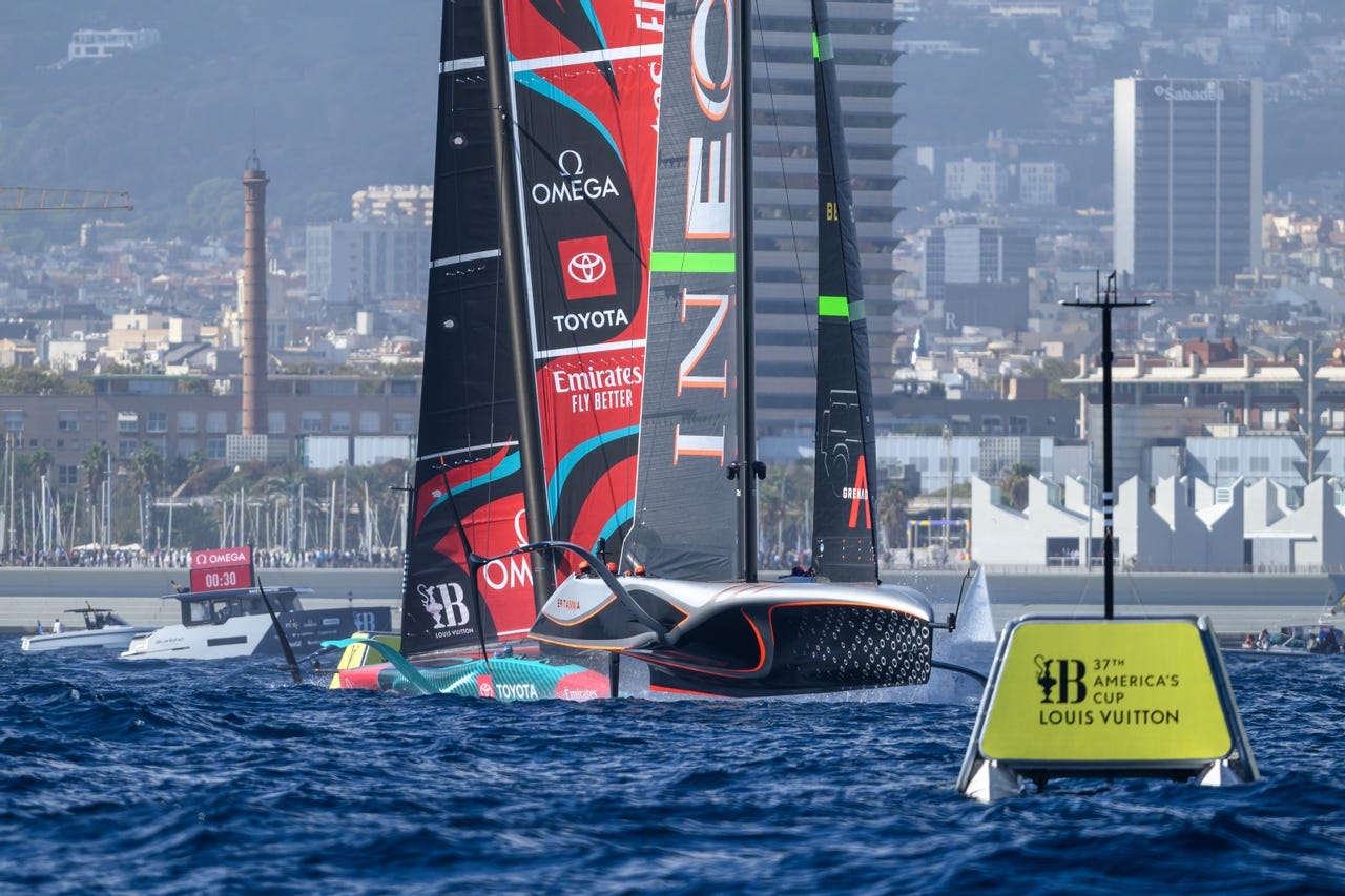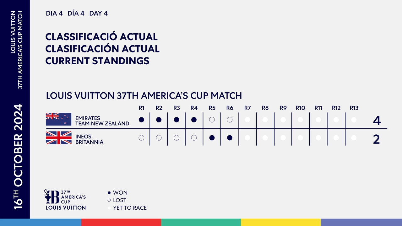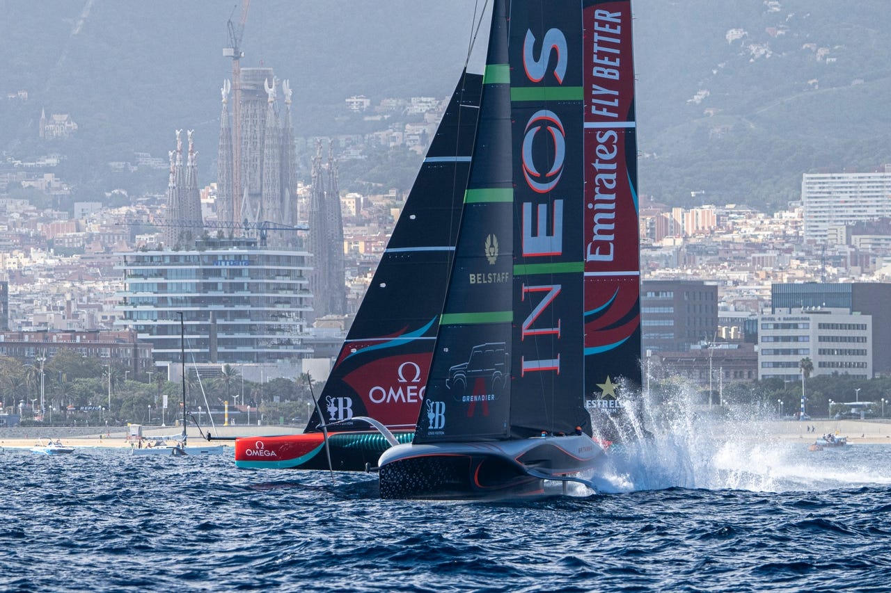 A warm and humid day in Barcelona yielded southerly thermal breezes of 7-11 knots for two absorbing races in the Louis Vuitton 37th America’s Cup Match that saw INEOS Britannia, the Challenger of Record, take back-to-back victories to move the scoreline to 4-2.