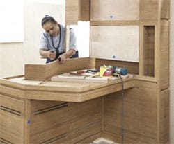 In addition to being lightweight, with top-notch aesthetics, materials also have to be stable and resist any tendency to warp, even at extremes of temperature and humidity. Materials used by Southern Wind, in addition to foam sandwich, include a 20mm thick honeycomb with a core of kraft paper that has 95 per cent open space inside, and a 1.5mm okoume facing. This has a very high strength to weight ratio, yet the density is only 20 per cent of that of typical marine plywood and less than half that of foam core panels.