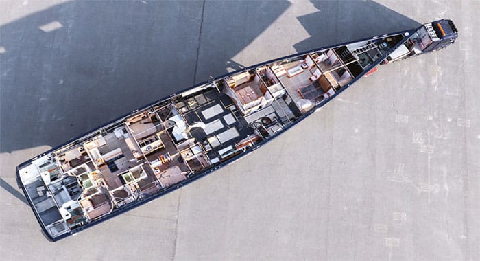 One major difference between this latest generation of Swan superyachts and the previous one, as Germán Frers points out, is that hull construction has become much more sophisticated. All models in the current Swan Maxi range are full carbon composite builds, with Corecell and Gurit Sprint laminates. The hull and deck manufacturing process includes two-stage post-curing in a digitally controlled oven for about 20 hours, following a temperature curve up to 90°C, with a final post-cure for the structural assembly. Nautor’s build quality and standard of finish are of course core pillars of the shipyard’s reputation, along with the refined sailing characteristics that have always defined the Swan brand.