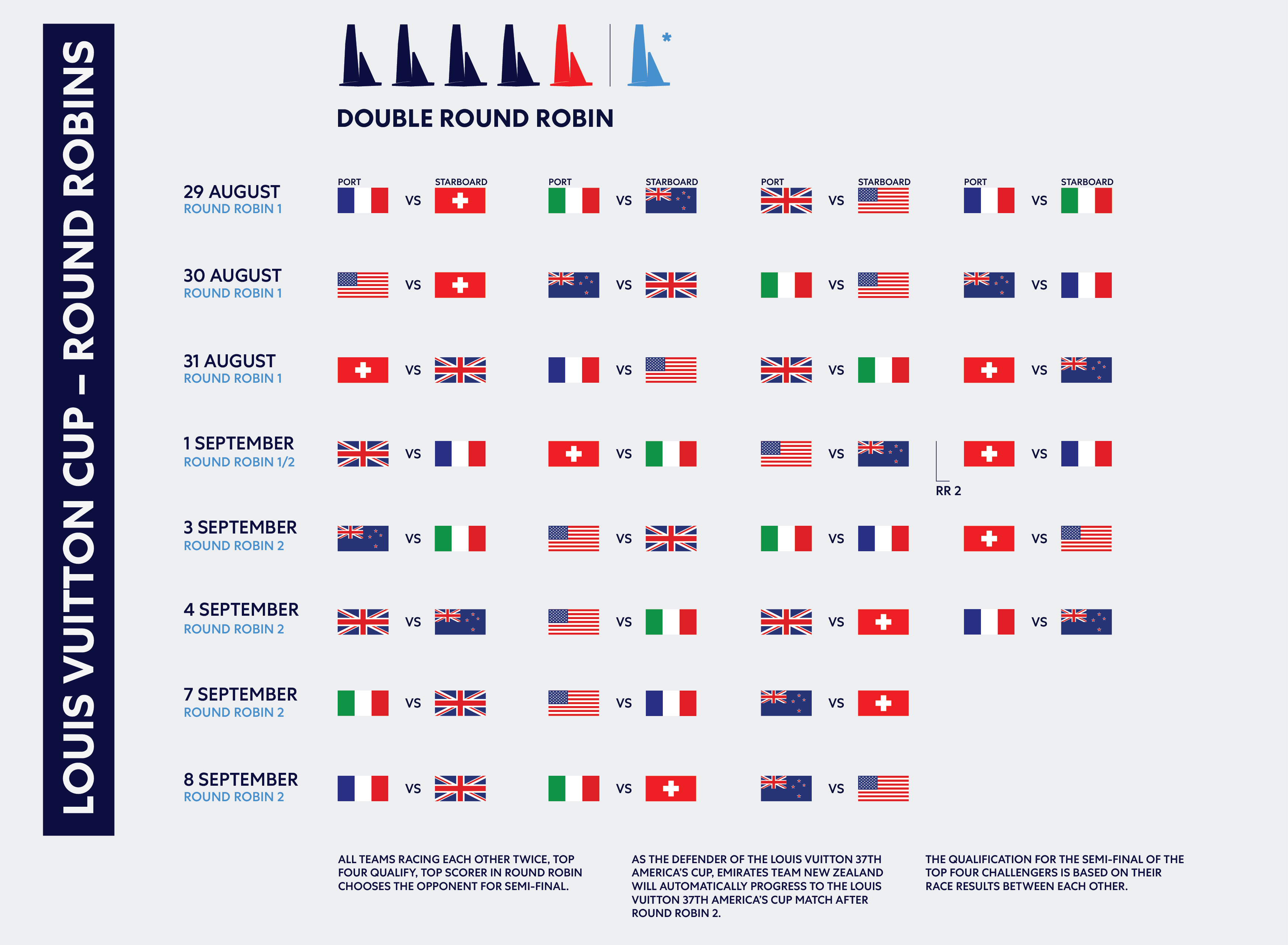 The Louis Vuitton Cup starts on Thursday August 29 when we will see a blockbuster re-run of the Louis Vuitton Preliminary Regatta final between Emirates Team New Zealand and Luna Rossa Prada Pirelli, in the second race of the day, whilst INEOS Britannia and NYYC American Magic face each other in a fascinating and important race for both teams. Orient Express Racing Team has two races on the opening day, first against Alinghi Red Bull Racing and, in the final race, against Luna Rossa Prada Pirelli. Conditions are expected to be light with the breeze coming in from the east-south-east and a slight sea-state.
