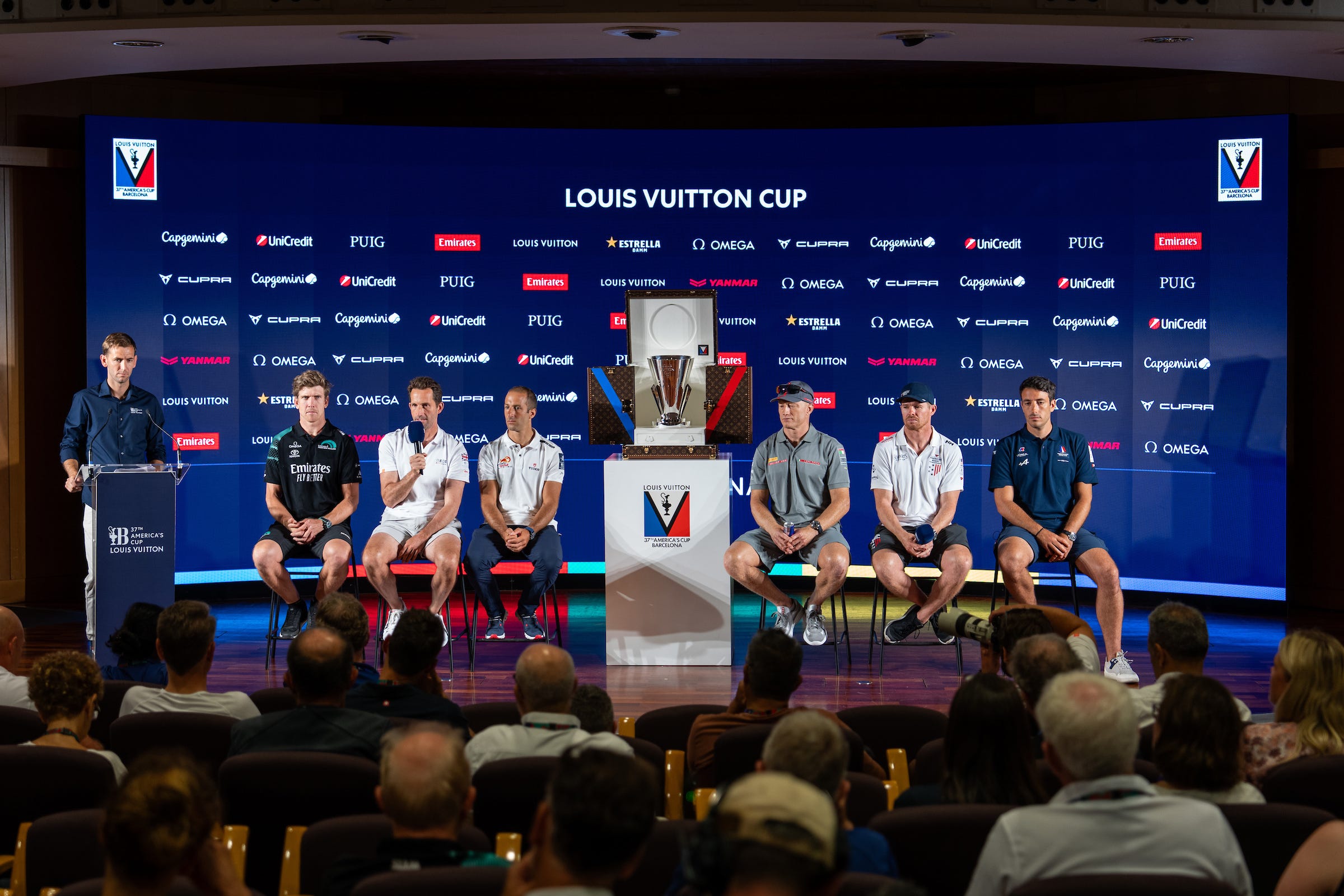 There was a serious tone to proceedings at the press conference ahead of the start of the Louis Vuitton Cup – which begins todays at 1400 CET – with a palpable feeling of tension on the stage where the six assembled helmsmen sat either side of the glistening Louis Vuitton Cup. And rightly so, for the five Challenger teams everything is on the line now, with every race and every point counting – plus the brutal reality that at the end of the upcoming eight-day double Round Robin series, one Challenger will be eliminated.