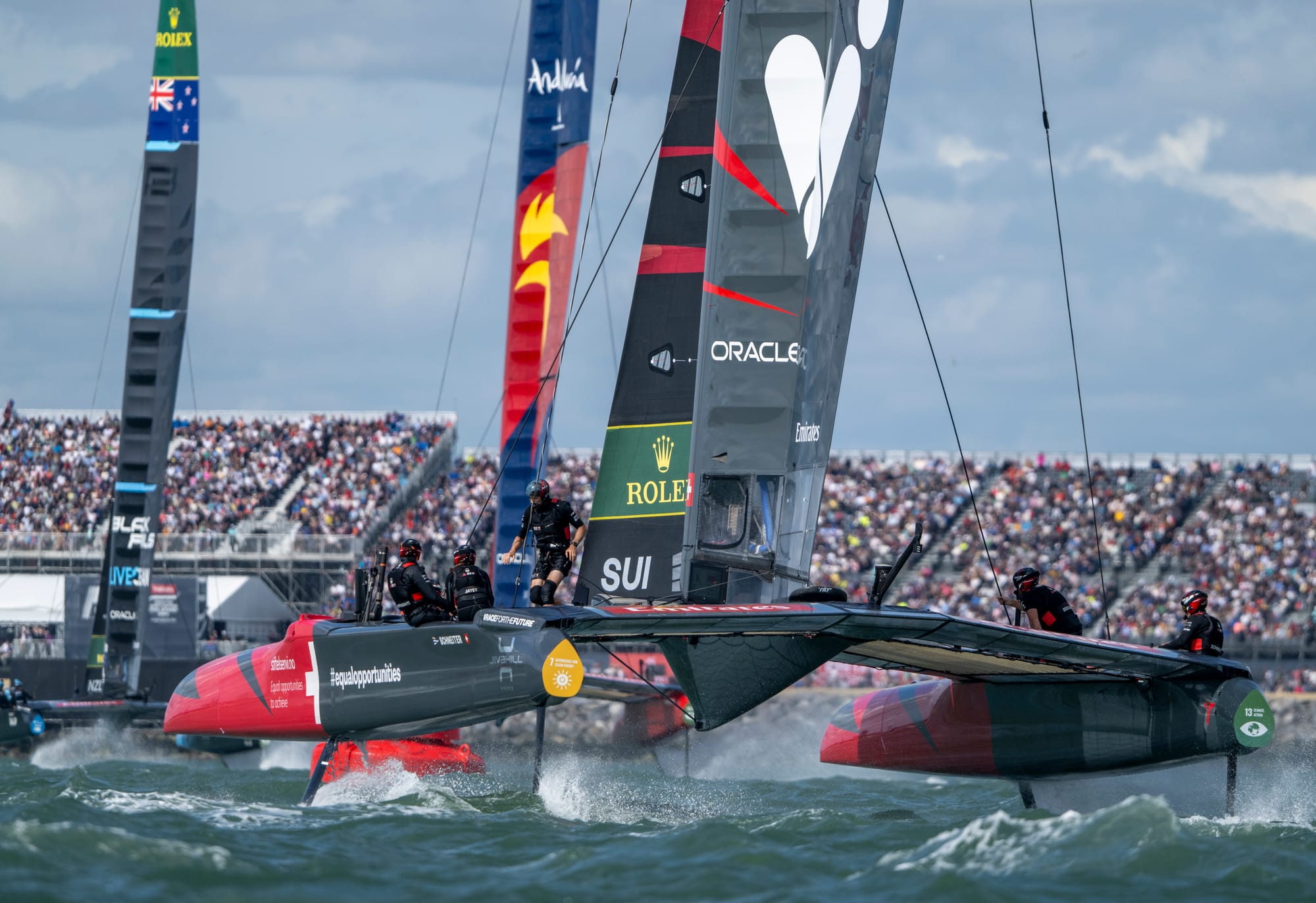 The final saw the British, Kiwis, and Swiss line up to do battle for the overall result. The Swiss team, led by Sébastien Schneiter were in their first ever final and were somewhat outclassed by the Brits and the Kiwis who had a good battle, rounding the final windward gate with the New Zealand crew just ahead. The two teams split sides on the final run with Burling & Co. doing enough to stay in front at the finish, leaving another packed grandstand crowd cheering the British home in second.