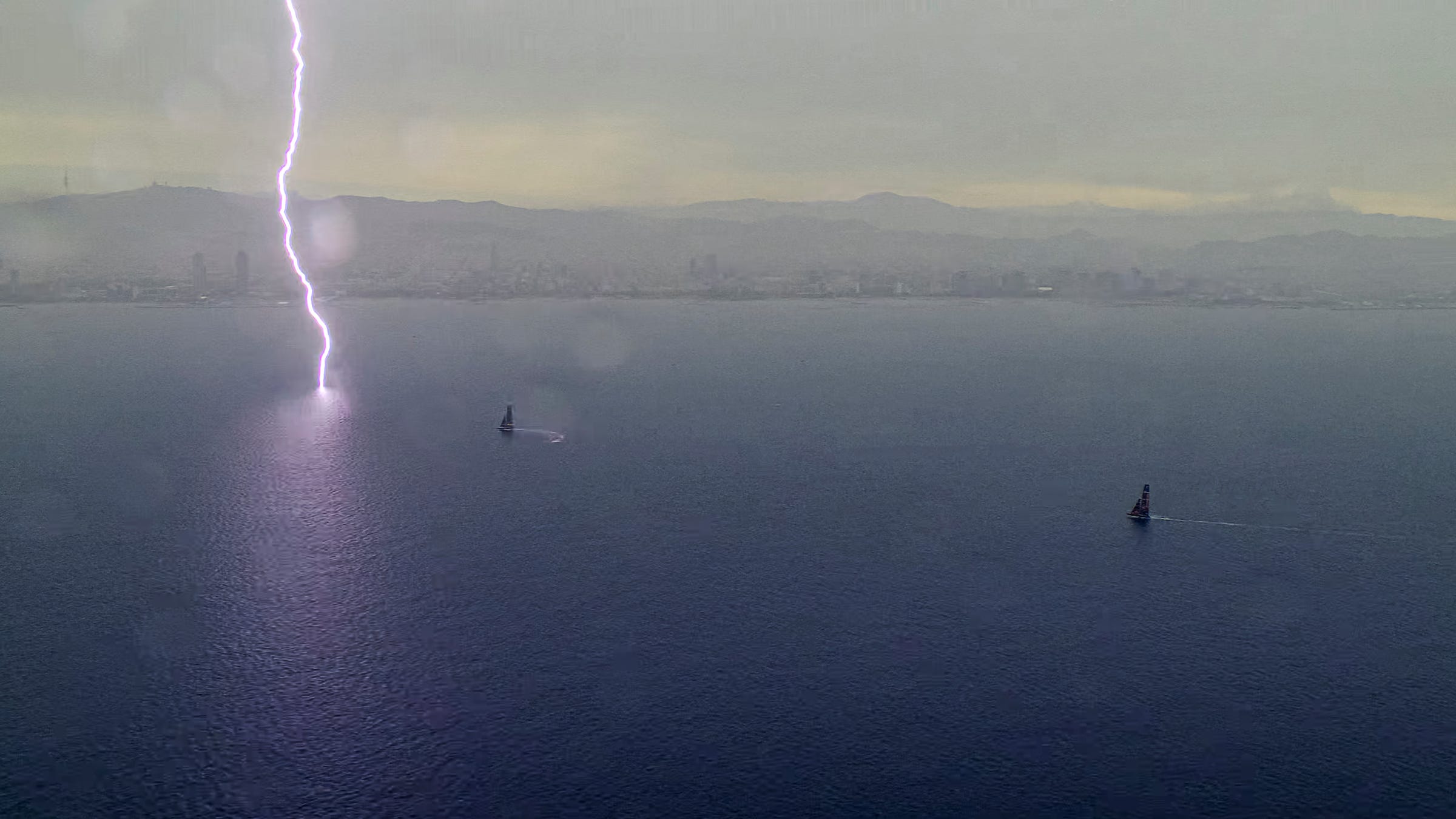 Gassing the Kiwis in the final approaches to the line and forcing them into a low-speed tack that saw Emirates Team New Zealand off the foils, gave full advantage to Luna Rossa, who survived a nervy sky-rocket broach on a tack exit to lead at every mark. Drama, however, ensued on the final downwind to the finish with the weather deteriorating and rumbles of thunder heard close by, when a lightning strike was spotted hitting the water just a few hundred metres ahead of Luna Rossa on their way to the finishing line.
