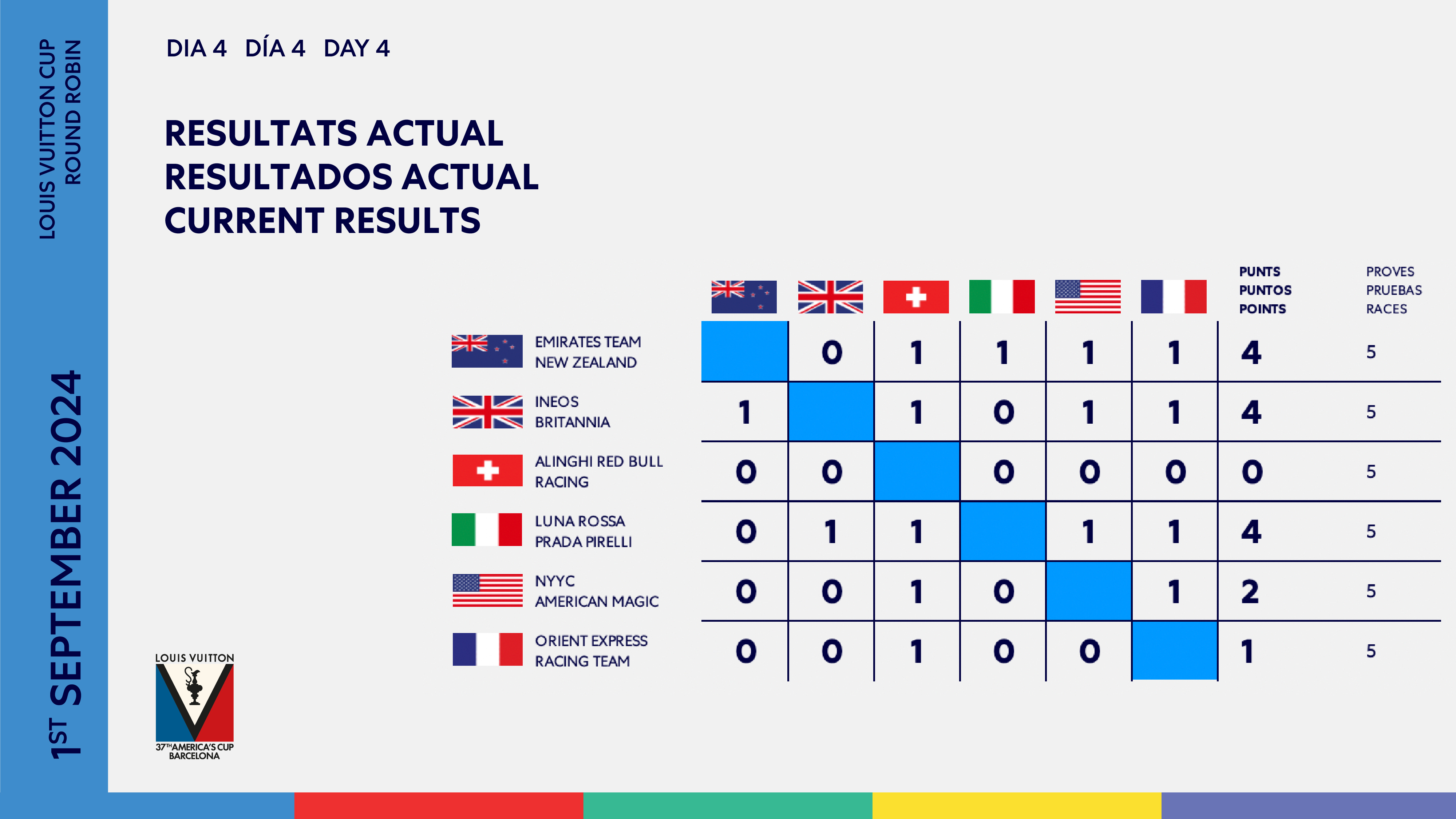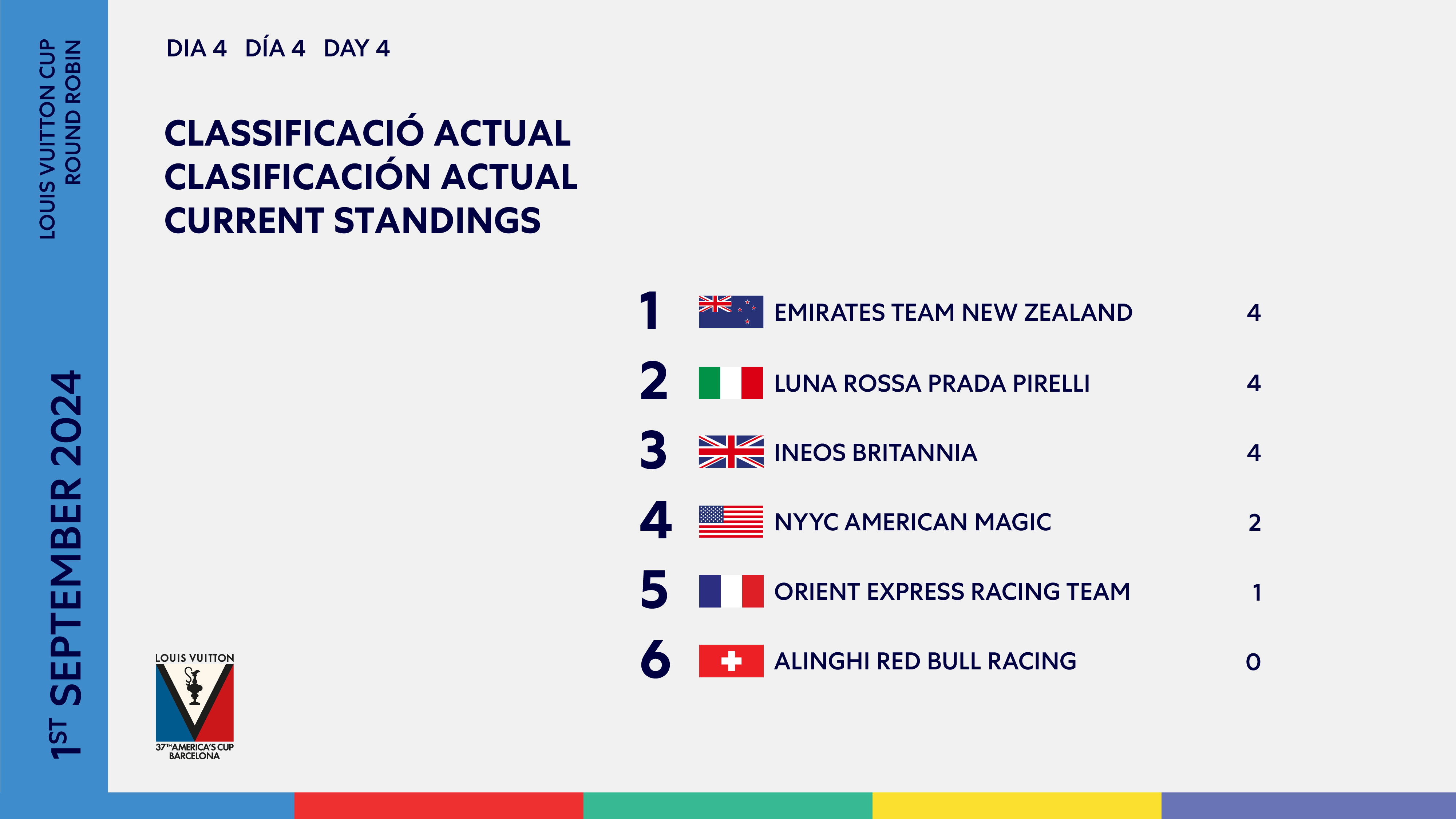 In the overall standings (including the Defender) three teams finished the opening Round Robin with four points – Emirates Team New Zealand, Luna Rossa Prada Pirelli, and INEOS Britannia. Meanwhile, in the Challenger-only standings Luna Rossa Prada Pirelli are on top having delivered a perfect 4-0 scoreline.