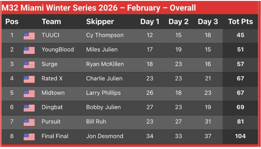 Driver Cy Thompson, tactician Lucas Calabrese, John Wallace, C.T. Olander, and Charlie McHugh delivered a steady, high-confidence performance across three days on Biscayne Bay.