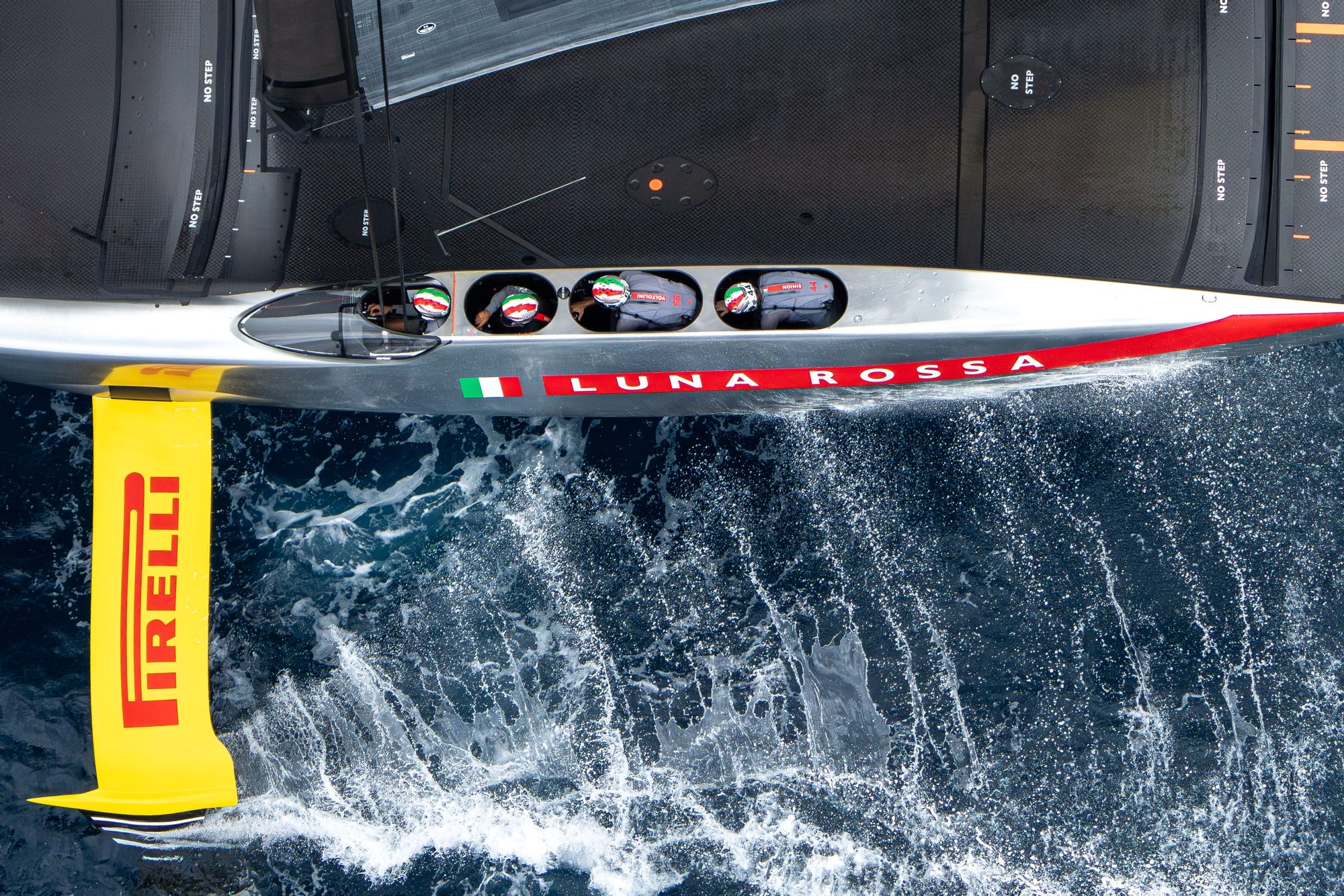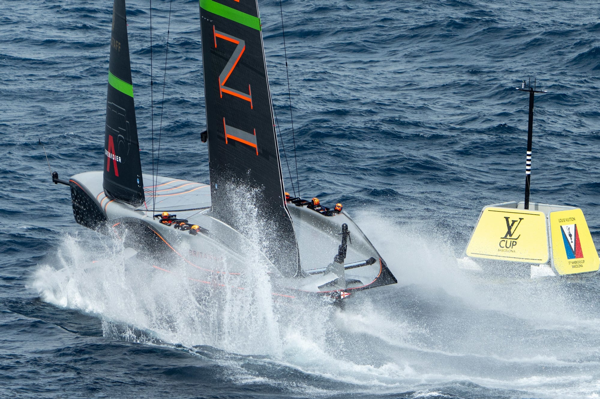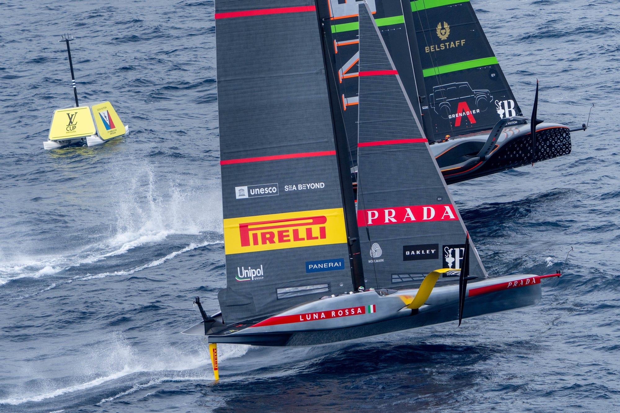 On the next cross, the roles were reversed, with Britannia holding the right-of-way, and at the first windward gate both boats executed fine tack-bear-away manoeuvres (one of the hardest roundings to pull off in these foiling AC75 yachts) with a two second advantage to the Italians.