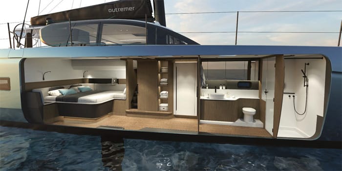 ‘The master on the starboard side has a king-size bed, 1.8m wide, with side access. It’s very comfortable, a lot of storage and a big bathroom forward. We didn't want to do a full-length master cabin in one hull because it's a waste of space, you don't need it. If you want a very big master, you can have it on the port side but most people prefer to have another room.’