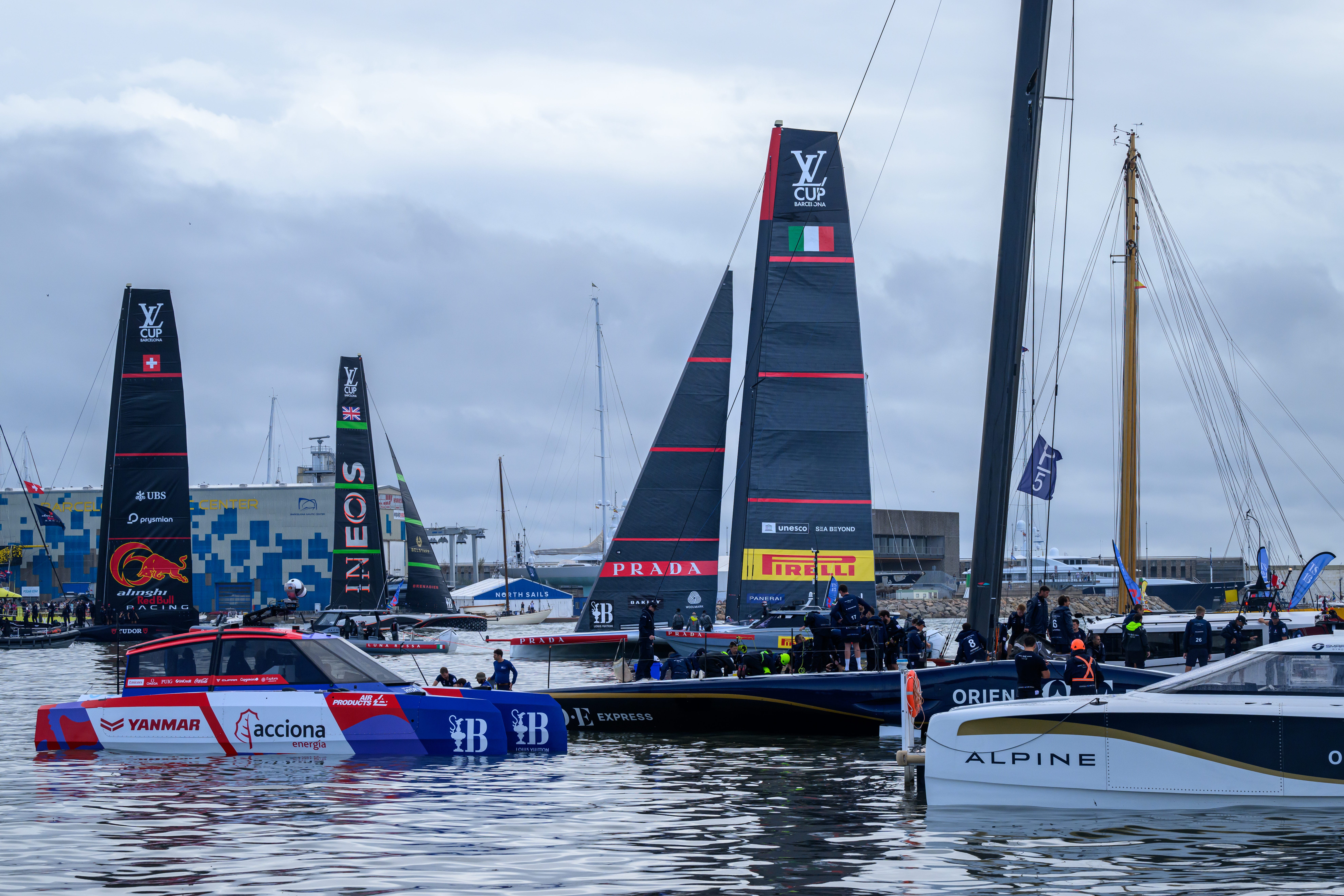 The precautionary move on the part of the Race Director was fully respected by all the teams with further instructions that the Race Committee would be monitoring the situation with the intention of starting racing later in the afternoon. Unfortunately, at 1610 the decision was taken to cancel racing for the day with the wind just not settling, despite the storm clouds clearing, and the boats, who had re-set up along the Barcelona waterfront, towed back to harbour.
