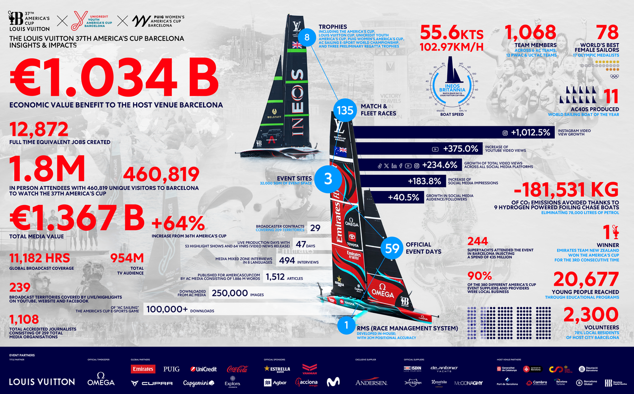 - Total gross brand exposure value of €1.367 billion for all of the brands, sponsors and host venue associated with the 37th America’s Cup.